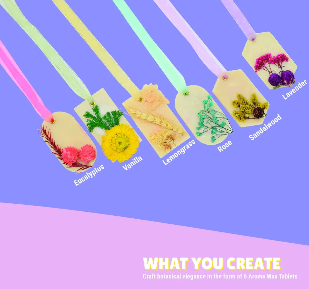 Unbox a complete DIY experience with all the essential materials neatly packed inside. This kit provides everything you need to create six exquisite botanical aroma wax tablets with ease.