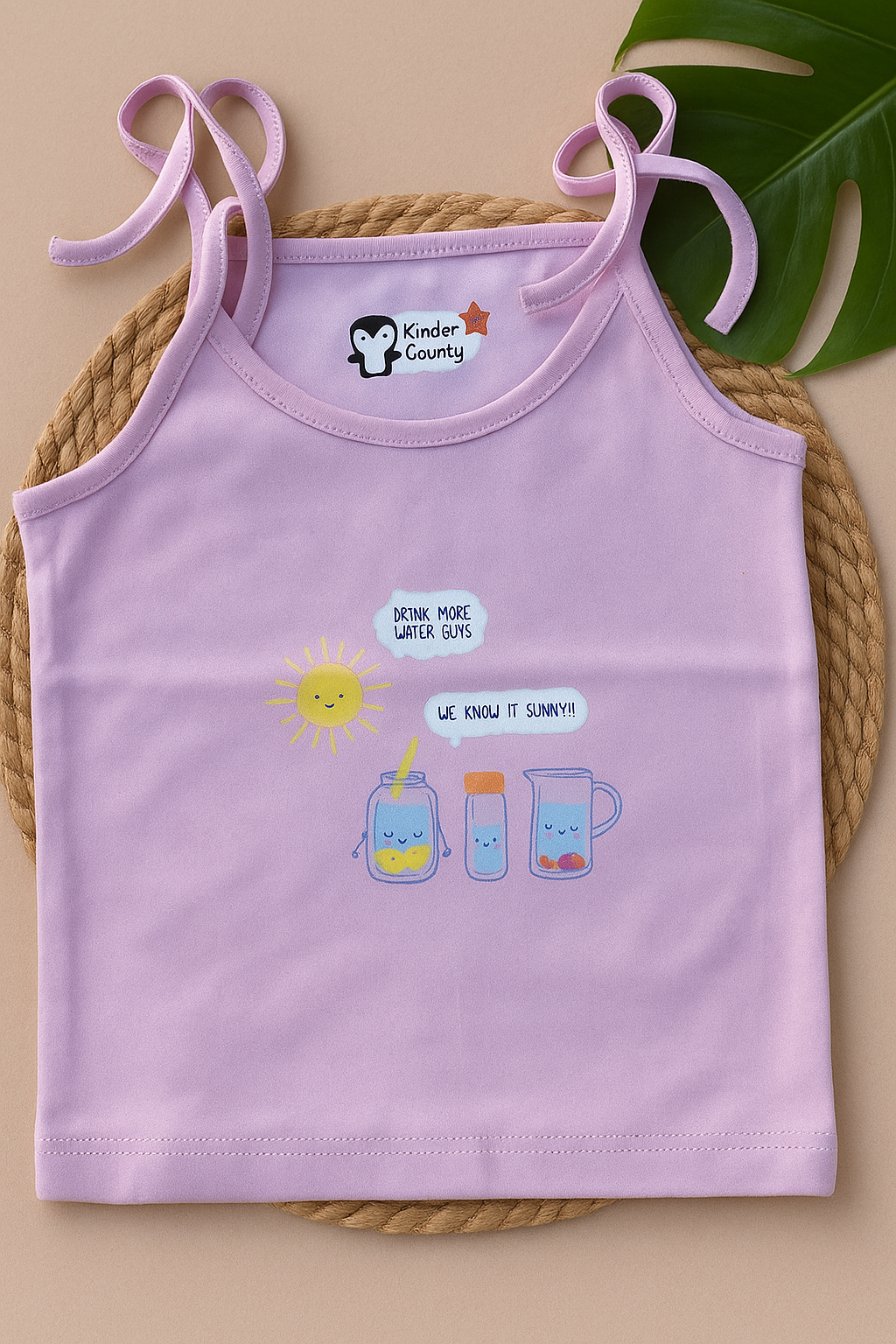 Keep your little one cool and hydrated in style! This lavender muslin cami features cute water bottles and a smiling sun reminding kids to “Drink More Water.”