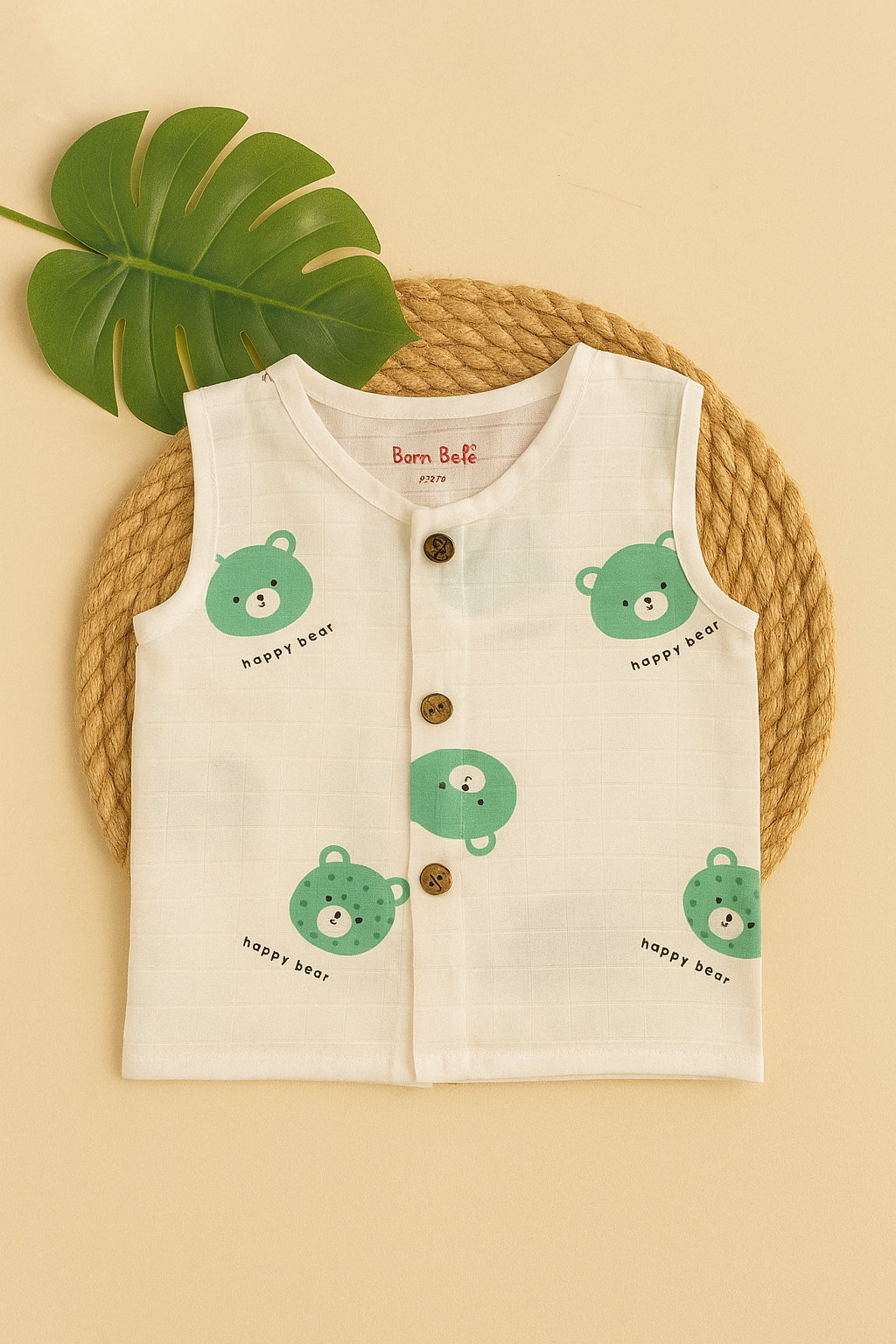 Adorable sleeveless jabla featuring cute green bear faces and “happy bear” prints. Designed for your baby’s all-day comfort during play and sleep.