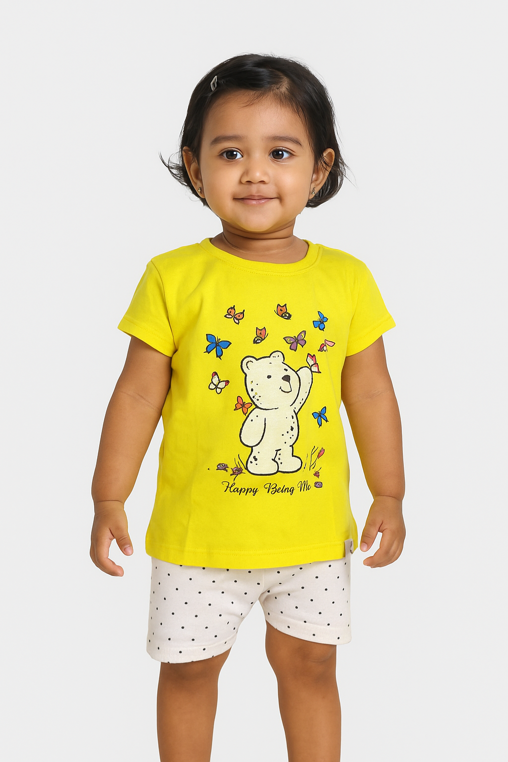 Yellow bear-printed tee with white polka shorts — happy, bright, and oh-so-cute!