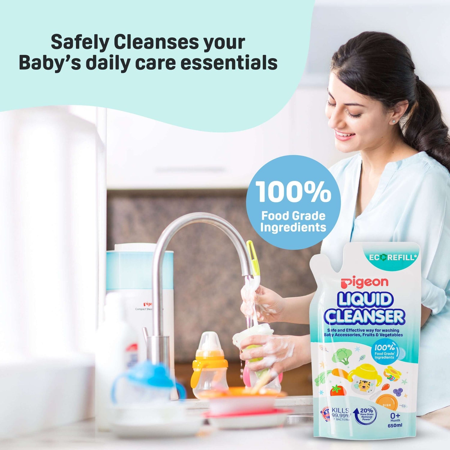 Keep your baby’s world safe and clean with Pigeon Liquid Cleanser Regular 650ml Refill. Specially formulated to remove milk stains, dirt, and harmful bacteria, this natural cleanser is perfect for feeding bottles, nipples, pacifiers, toys, fruits, and vegetables.