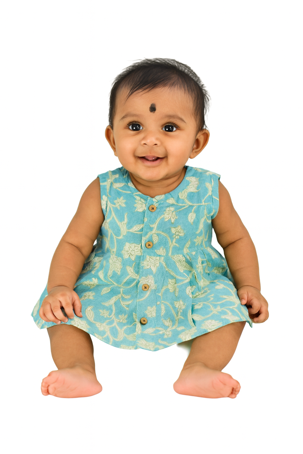 Soothing sky-blue sleeveless dress with delicate white floral motifs.