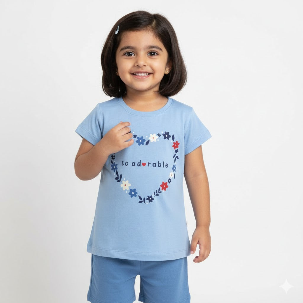 Blue floral heart-printed top with matching shorts — made for stylish comfort.
