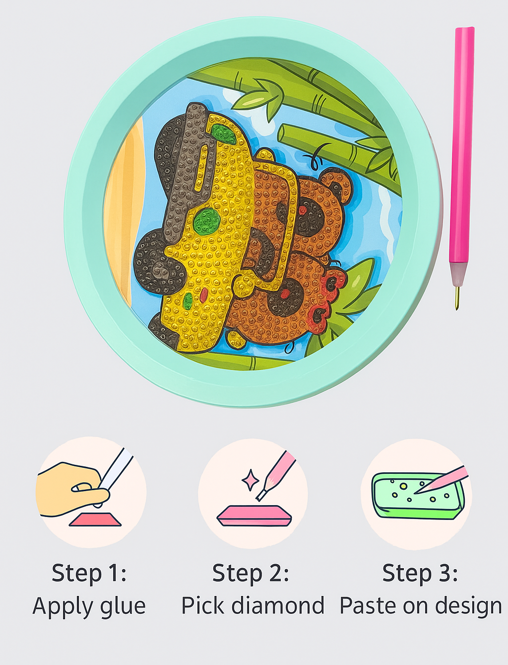 A fun and sparkly DIY diamond painting frame featuring a cute teddy driving a car! Comes with colorful diamond beads and tools — perfect for kids to enjoy craft time while improving focus and creativity. Ready to hang or display once completed!