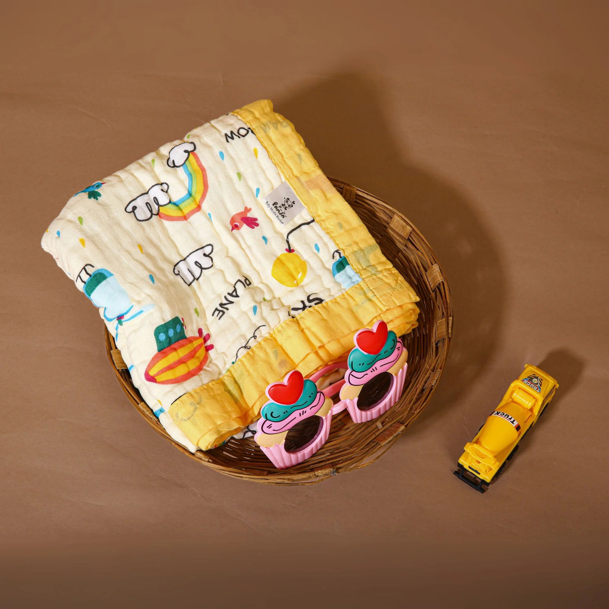 Bright and cheerful, this yellow-trimmed blanket with rainbows and clouds brings warmth and joy to your baby’s everyday routine.
