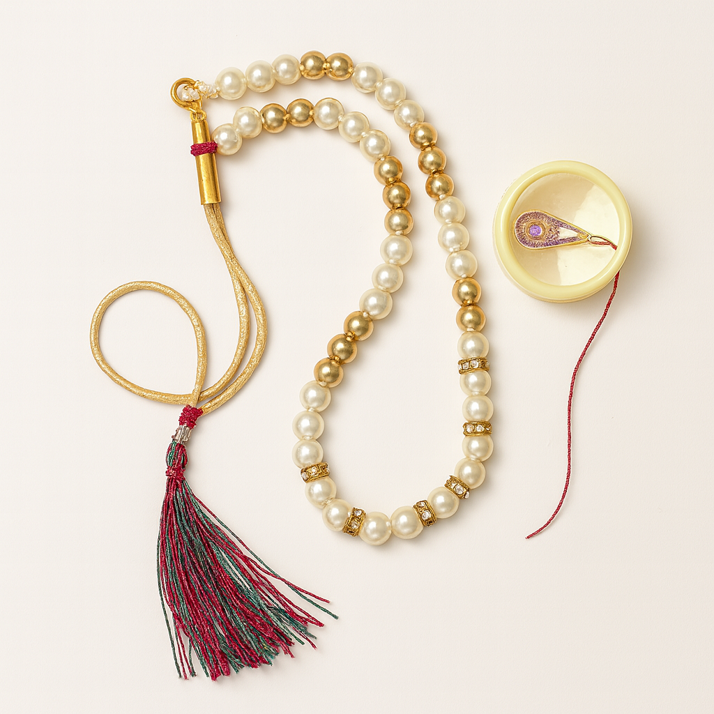 • Includes dhoti, mojaris, pearl mala & kalgi