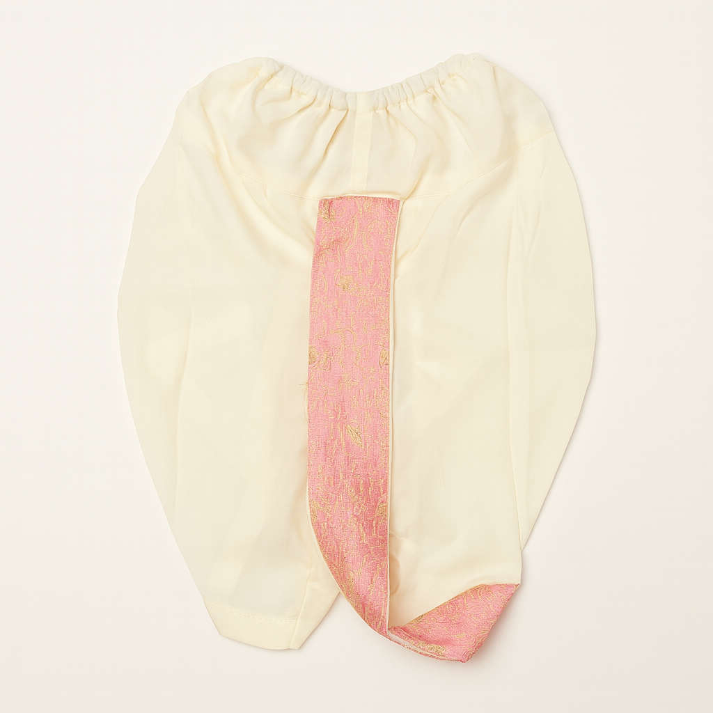 The ensemble includes a soft cream dhoti, matching mojaris, and a pearl mala with a red-green tassel and kalgi pin—completing the regal festive look. Designed with breathable inner lining and lightweight material, this outfit ensures your child looks stylish while staying comfortable all day long.
