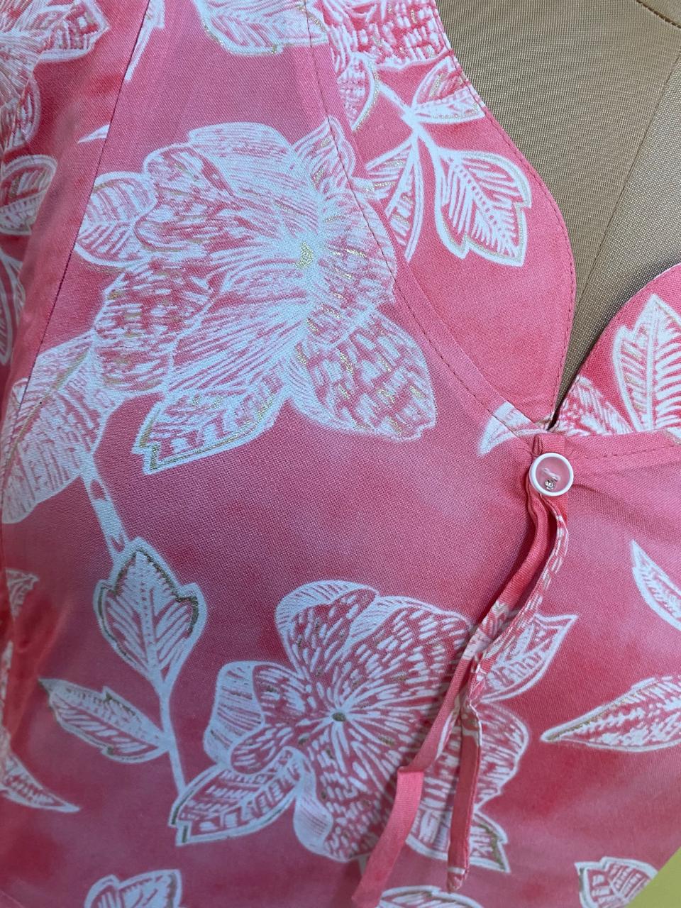 A charming rose pink maternity maxi dress adorned with delicate floral patterns. Designed for comfort and elegance, it features an empire waist and airy rayon fabric that keeps you cool and relaxed during pregnancy.