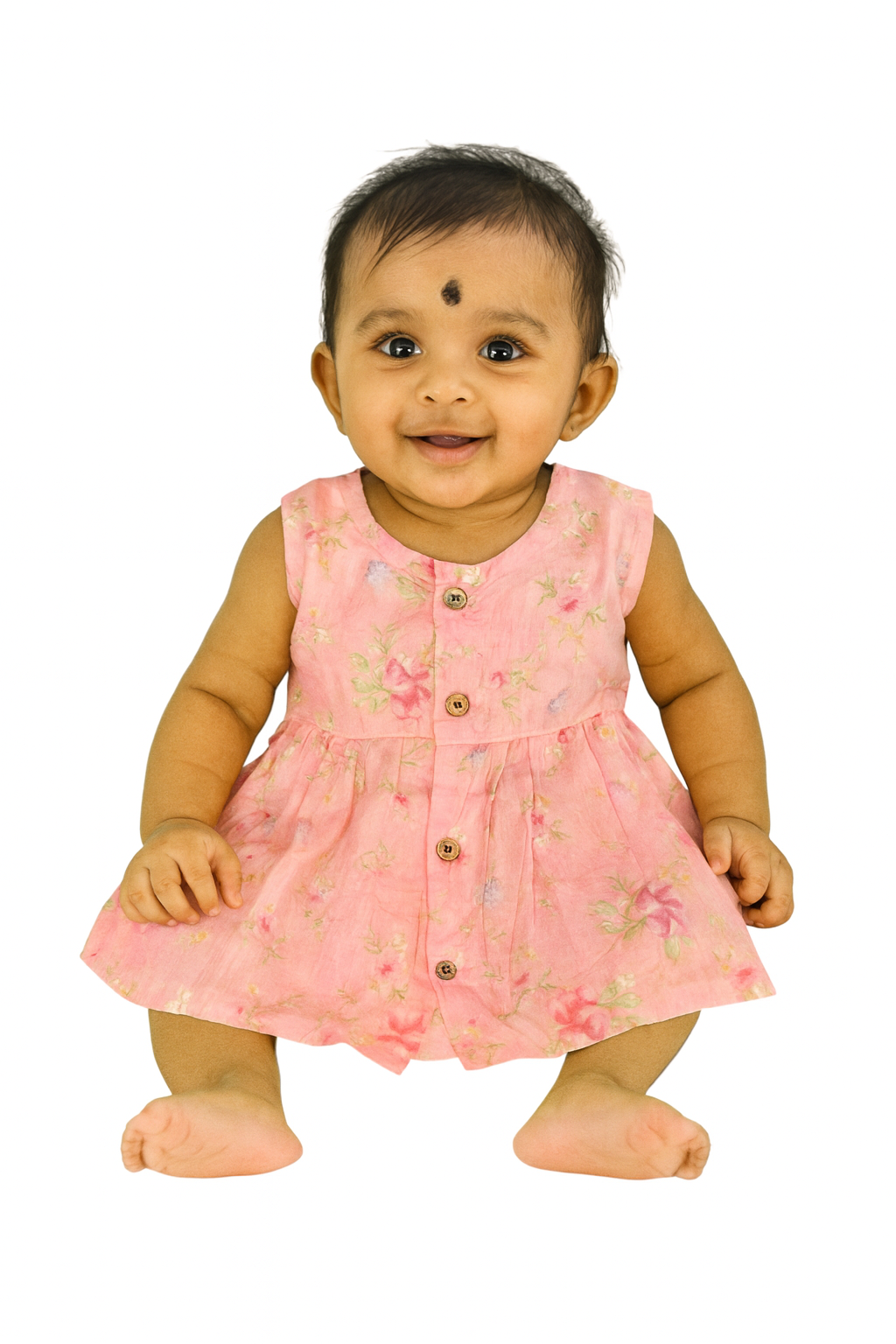 A delicate pink sleeveless dress with light floral patterns — perfect for a sweet, gentle look.
